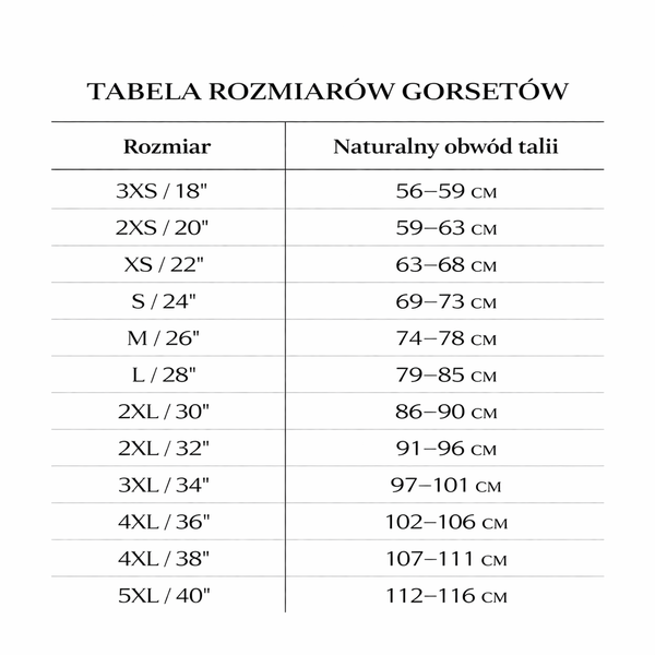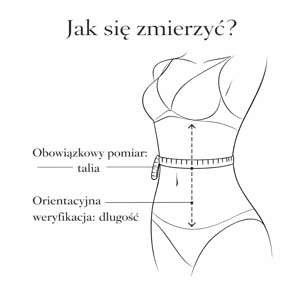 - jeśli nie widzisz naturalnego wcięcia w talii - np. figura typu jabłko- zmierz obwód brzucha około 2 cm nad pępkiem- nie przejmuj się każdym milimetrem, gorset ma dużą regulację